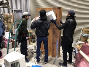 木の板を加工し壁に見立てて、ルームクーラー設置の工程を学びました。