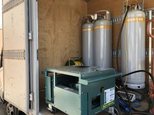 建物の横にトラックを配置し、中にボンベ、発電機、回収機等を載せたまま、